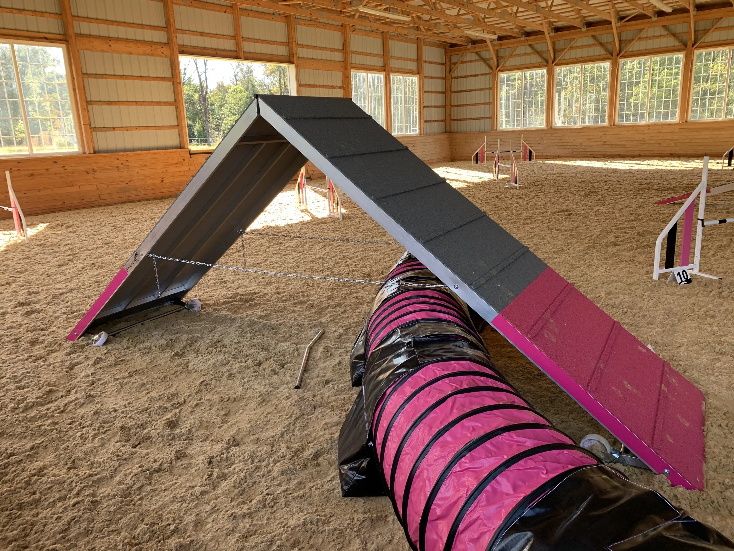 Its no secret at this point that I’ve opened my own training space. I stumbled upon this beautiful working horse farm on Facebook marketplace, and as soon as I saw the property I knew this would be the future home of Hounds of Heck. The grand entrance to the barn, flanked by wrought iron lights and adorned with a custom chandelier, makes a stunning first impression. The interior is a bright and welcoming 80 x 140’ space that provides ample room for big courses with big spacing, allowing the dogs to stretch their striding and run. The meticulously maintained GeoTex footing is light and fluffy, providing ample cushion from the high impact aspects of our sport, balanced with excellent traction for handlers and dogs alike. And don’t even get me started on the equipment! The quality and ingenuity of the Galican equipment is unlike anything else I’ve seen; plus it’s pink (what more could you want?)!